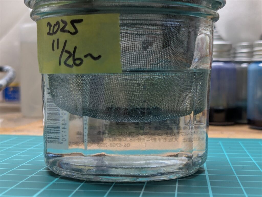 そのため私は、現在のシンナー液面にマスキングテープで印をつけて、減り具合を検証中です。