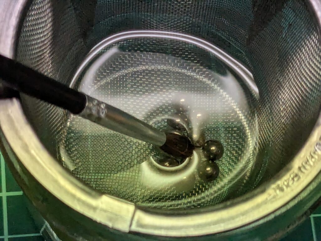 これでメタルボールが完全に洗浄液に浸かり、沈殿物だけが瓶の底に落ちていきます。