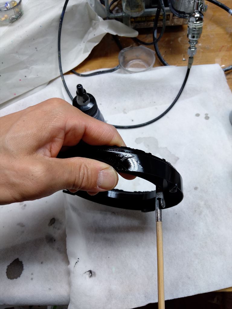 ラッカー塗料を吹く際、エアブラシのカップ内にアクリル塗料が残っていたのか、細かい塗料の塊が噴き出てきて塗装物に付着してしまい、塗装をやり直すことになりました。