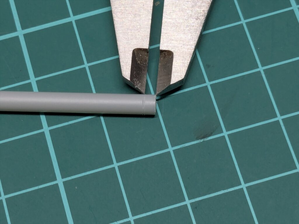 金属のノギスノ幅を2mmにして固定。プラ=パイプmp端にノギスの先端を当て、反対をプラ=パイプの側面に押し付けて傷をつけます。
