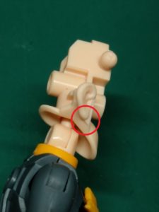 ここに30MM 1/144 オプションパーツセット 3のシールドのグリップを加工したものを接着します。