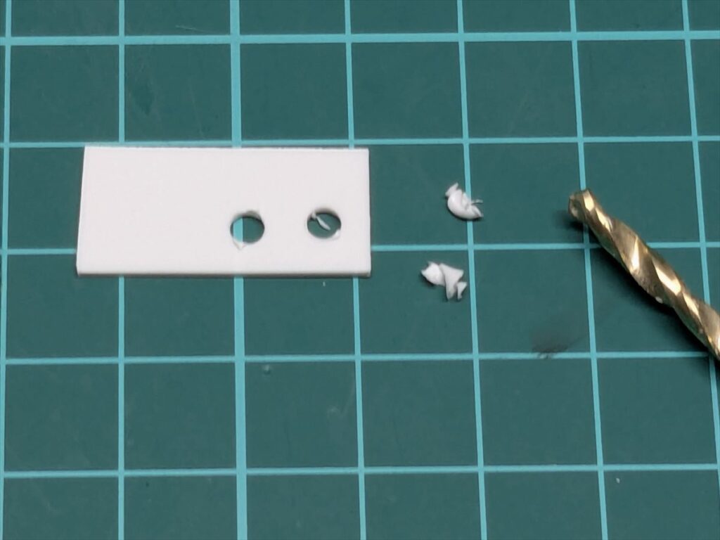 ドリルで穴を開ける際に切り出したプラ板を手で押さえるので、多少大きめにすると作業が行いやすいです。