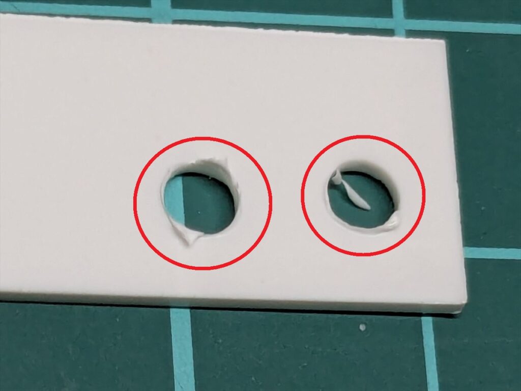 ドリル刃を通した後に穴の縁にバリができるのでヤスリなどで平らにします。