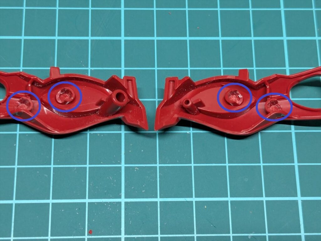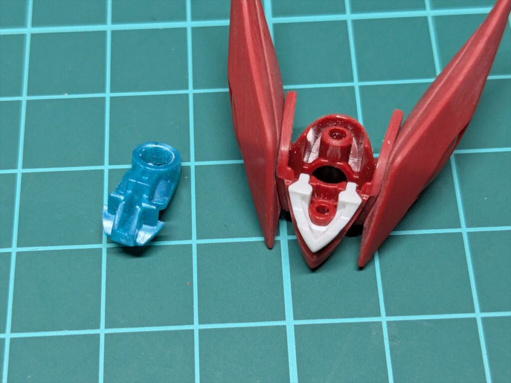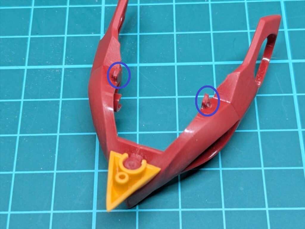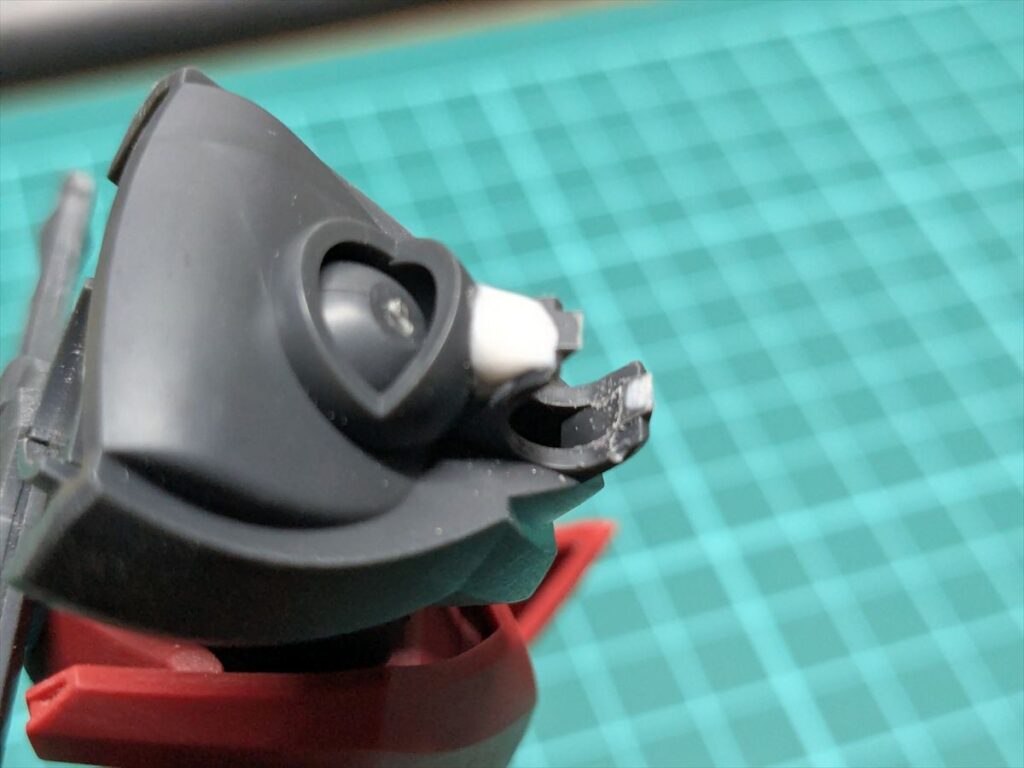 背中側から首元のパーツを差し込めるように、赤いパーツの接続穴の後ろ側をカット。