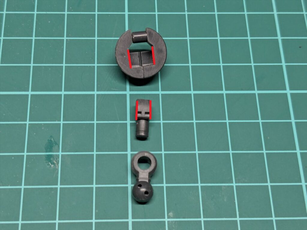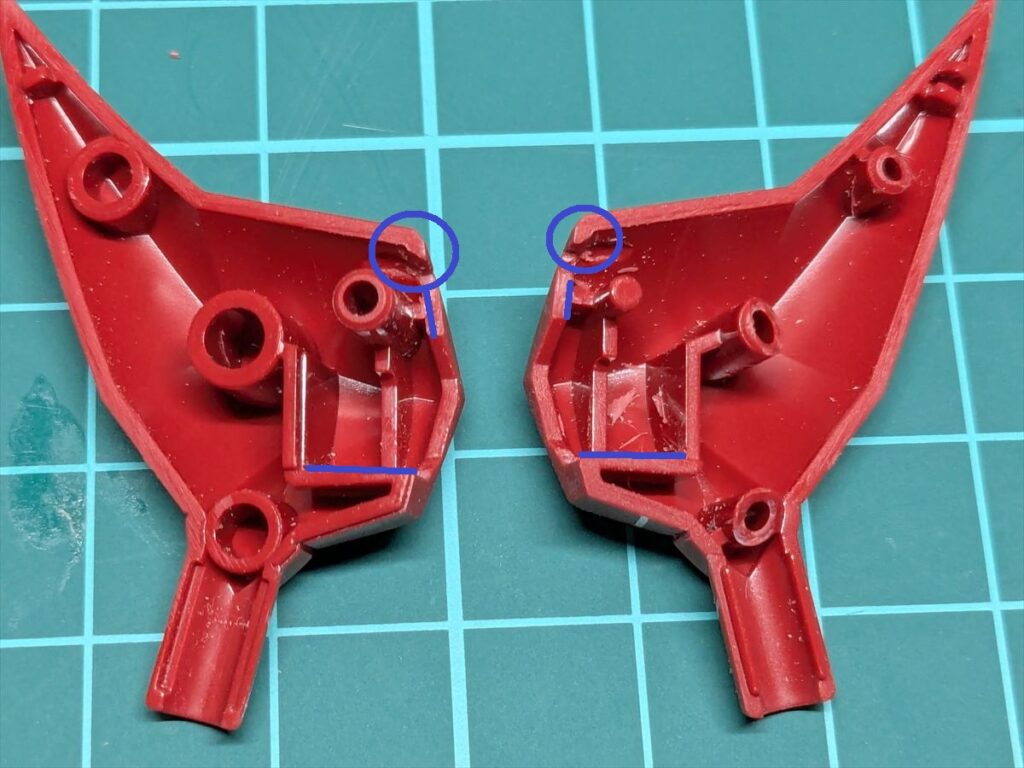 組み立て時に干渉しやすい部分を中心に、赤い線で示した箇所を削って可動域を確保しました。