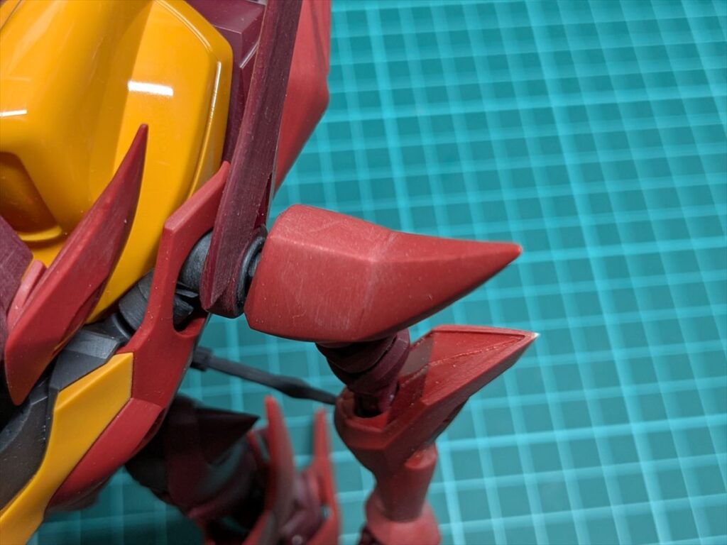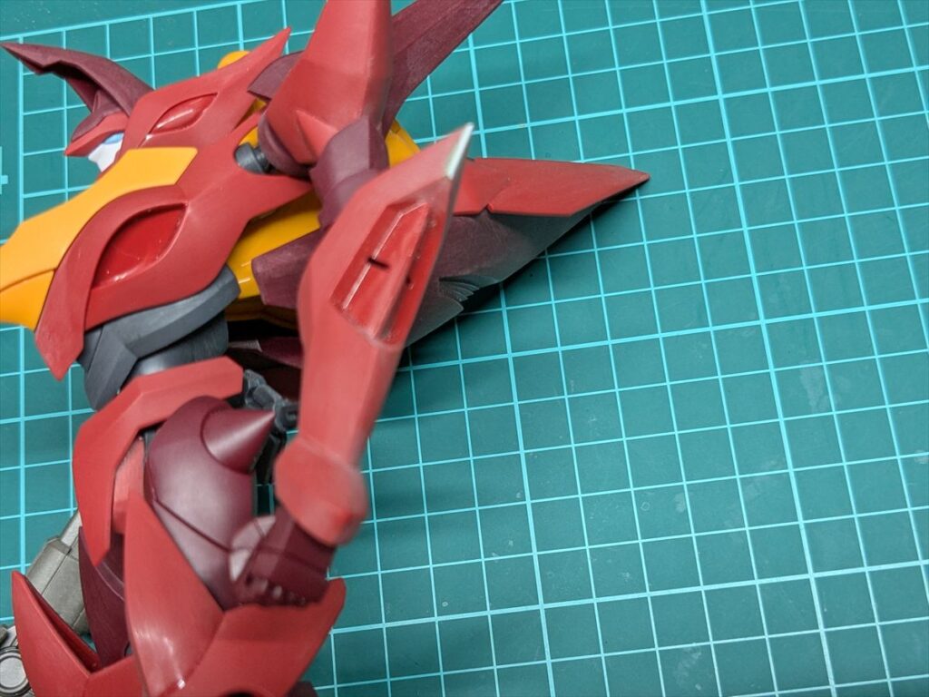 紅蓮の象徴的なエナジー・ウイングも可動軸の干渉があるのですが、後ハメ加工は難しく、可動軸が当たる部分を削ってから接着しました。