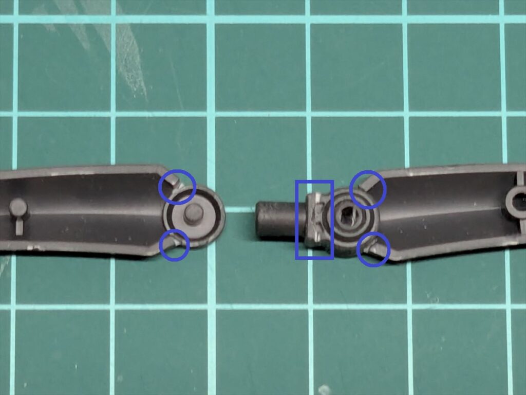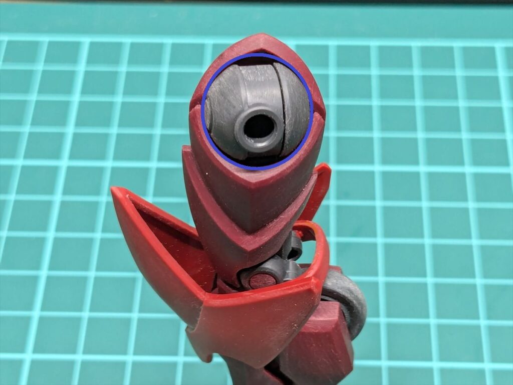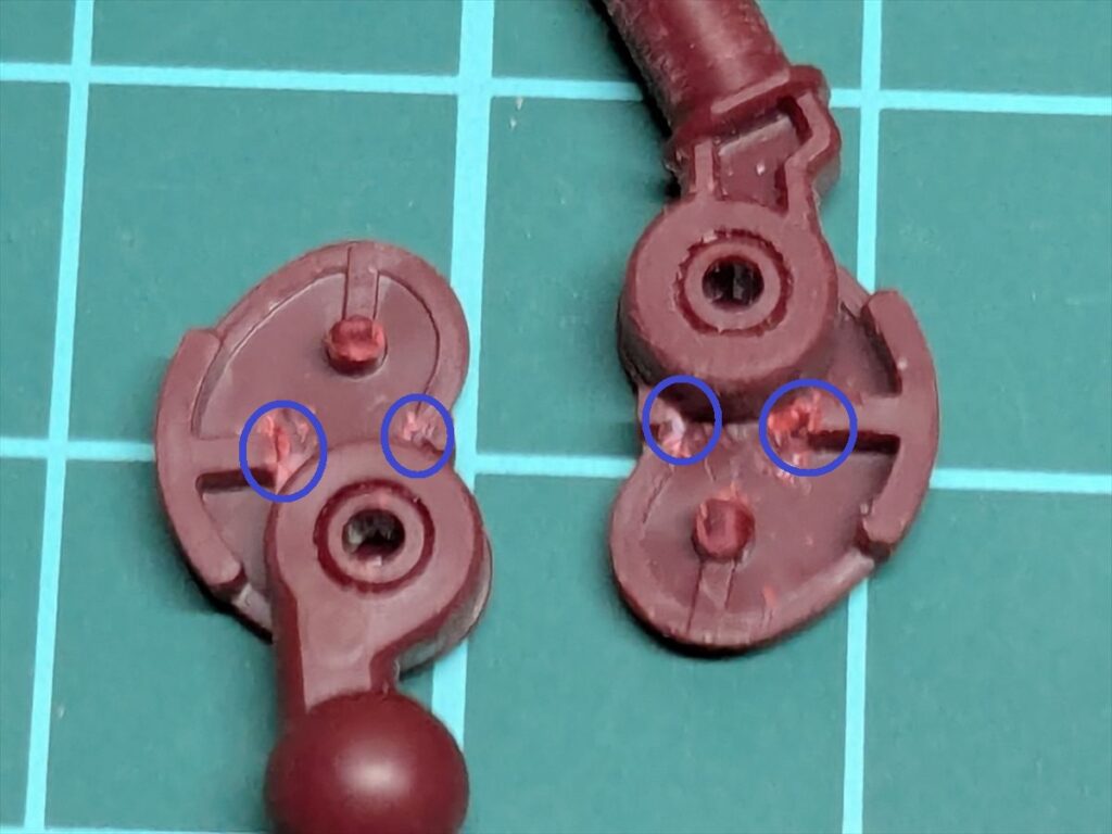肘関節内部の青丸部分も削って、塗膜が干渉しないようにしています。
