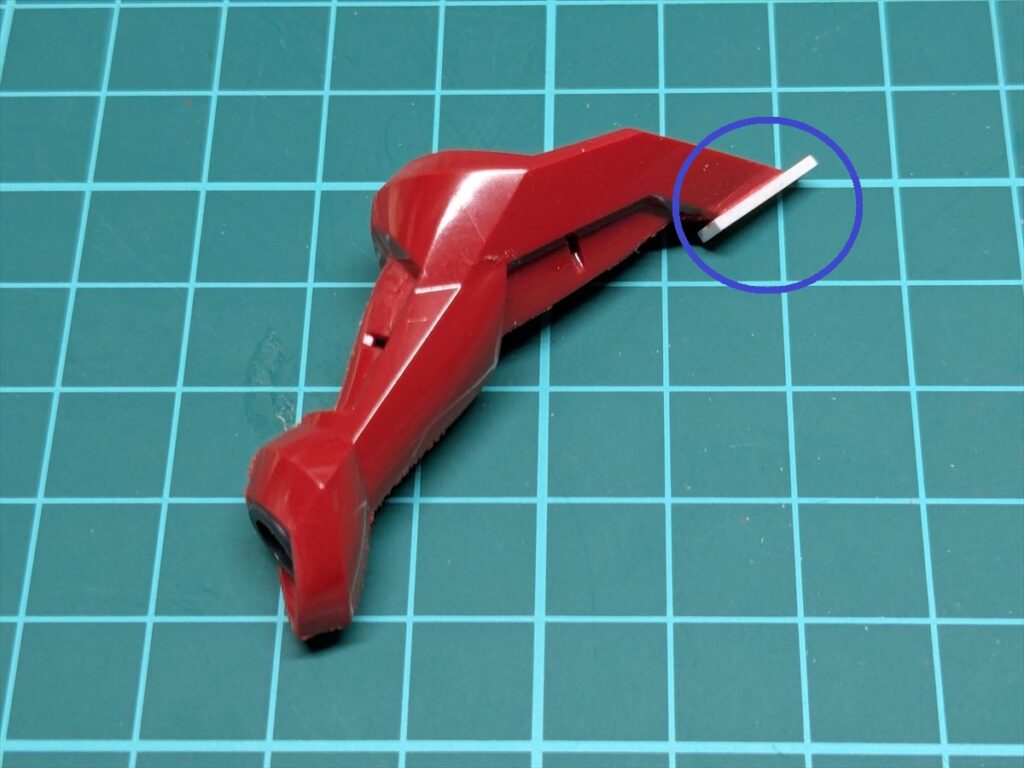 また、青丸で囲った部分には1mmプラ板を貼り付けて削り込み、エッジを立たせることで、より鋭いラインに仕上げました。
