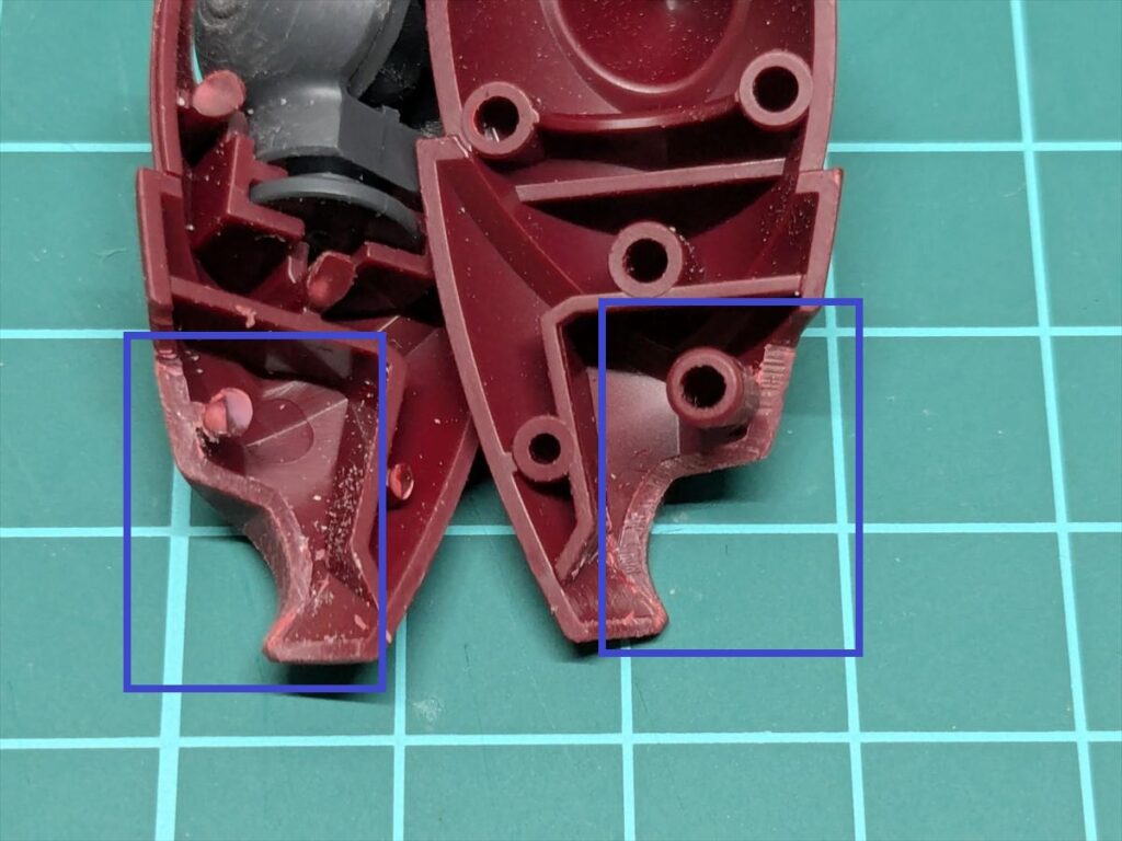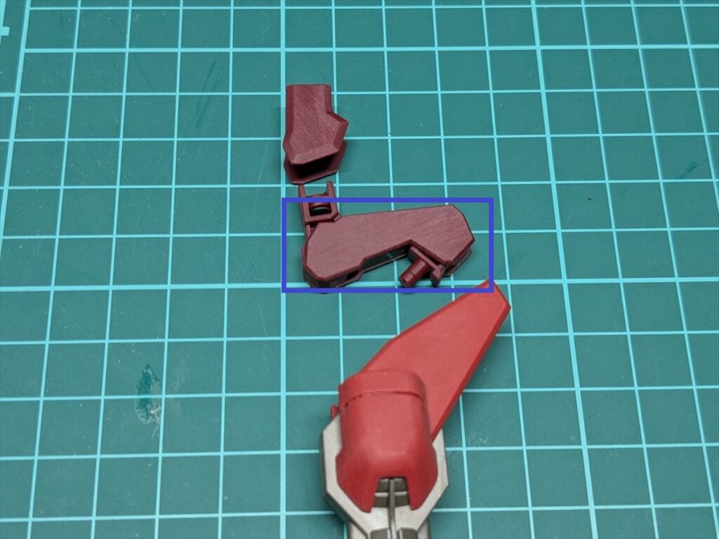 肘関節部分は青い四角で囲んだ面を広めに削り、塗装後でもスムーズに動くようにしています。