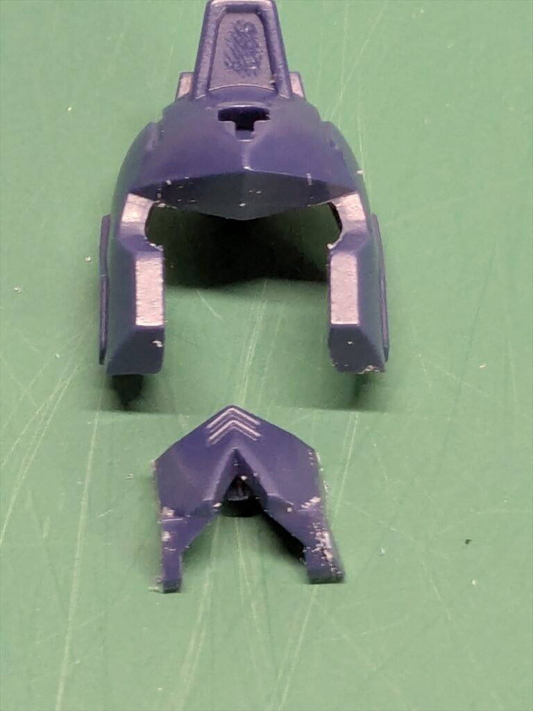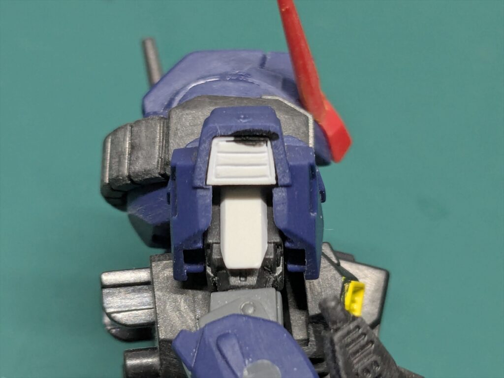 右頬を切る位置が悪く、頭部とフェイスパーツの間に隙間ができでしまったので、薄いプラ板を貼って隙間を埋めました。