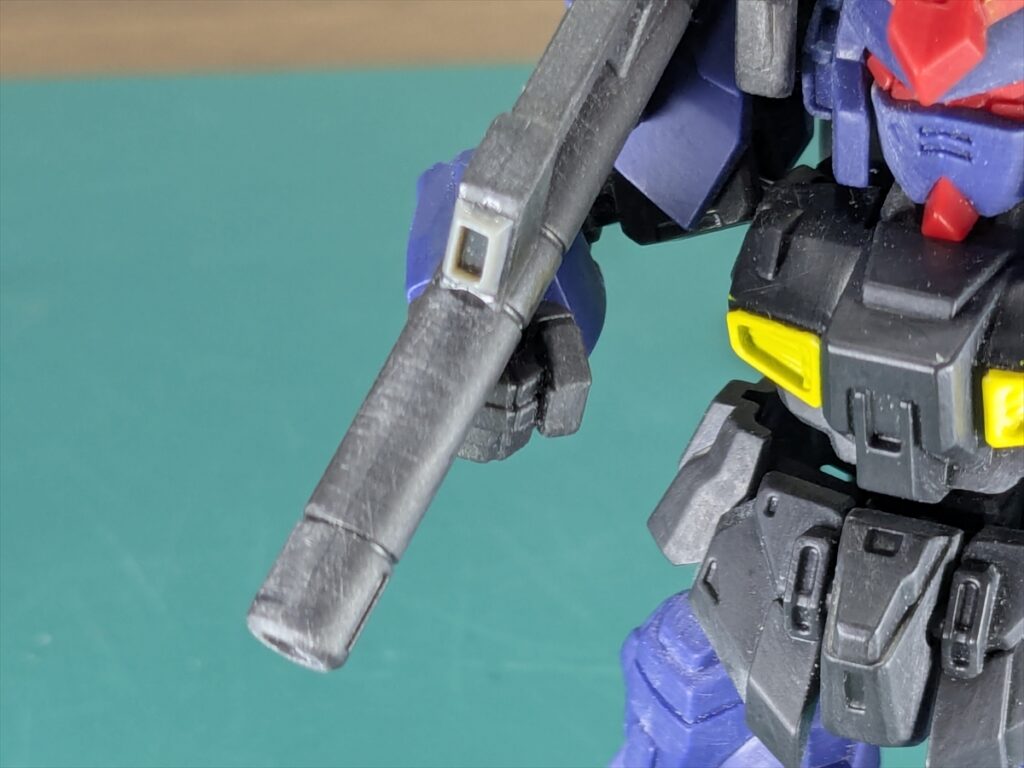 バズーカ側面にパーツの合わせ目が出てしまうので、カラーパテで埋めました。