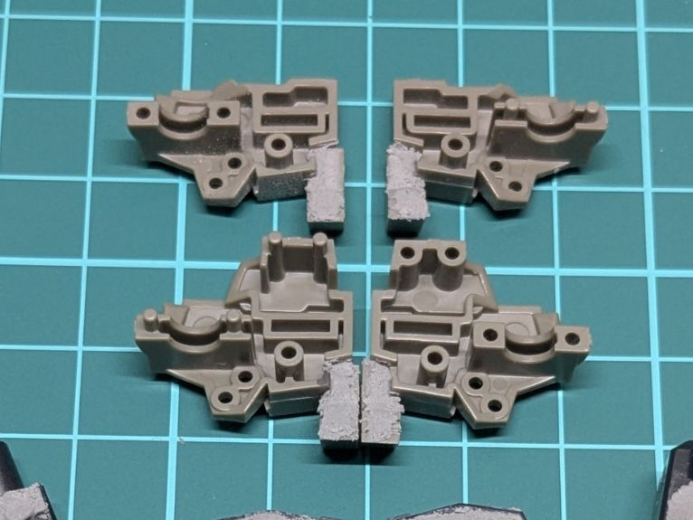 肩アーマー外側下にある肉抜き穴は、まずランナータグで埋め、エポキシパテでさらに塞ぎました。