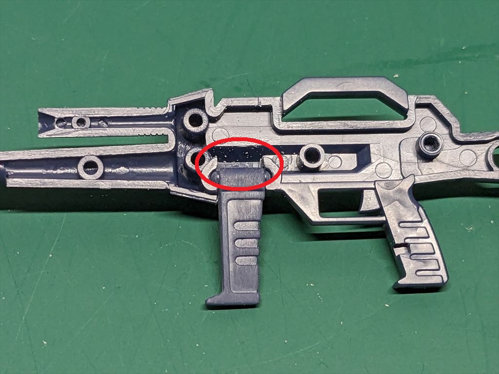 銃内部の赤丸で囲ったフォアグリップ可動部分上をカット。