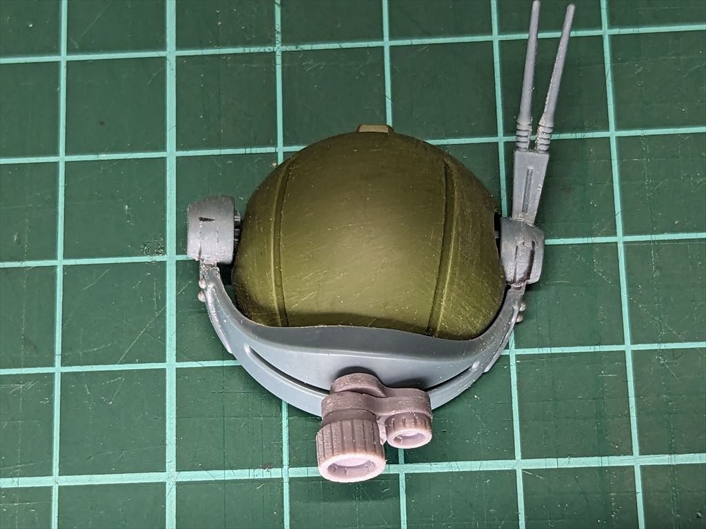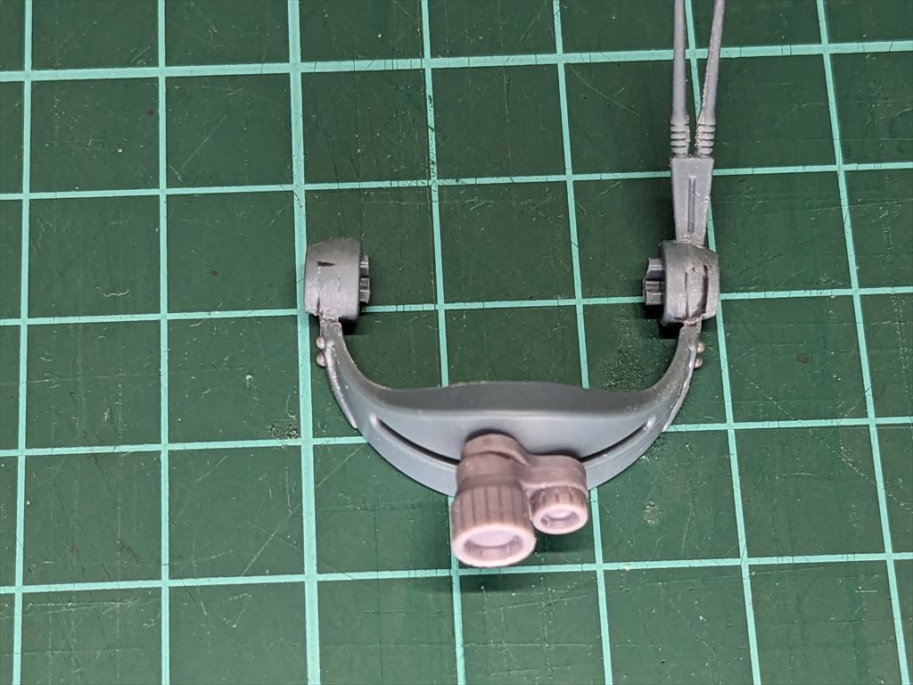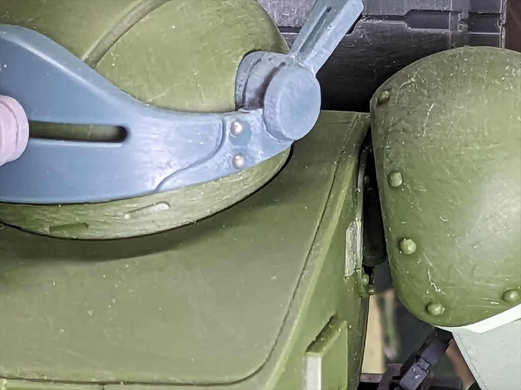 バイザー左右に設定上はリベット状のモールドがあるのですが、キットだと金型の抜きの関係からか、再現されていないので削り取り、WaveのR・リベット[丸]の1.0mmを接着して再現しました。