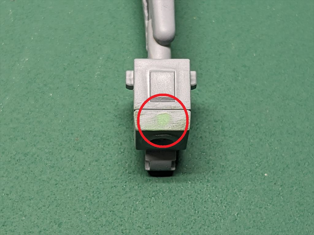 後ハメが困難な薄緑パーツには赤い丸の部分にスジ彫りを追加し、左右対称のモールドに変更。