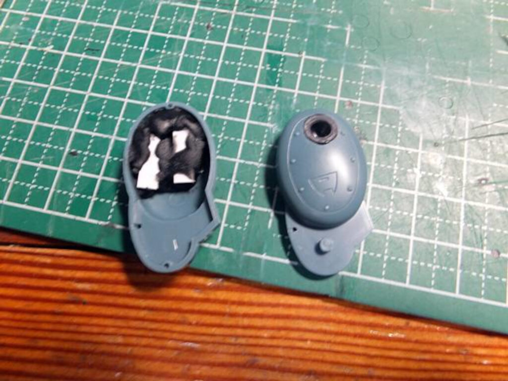 足首関節の穴の部分を上半分切ります。完成後は目立たない部分なので、大雑把に加工してあります。