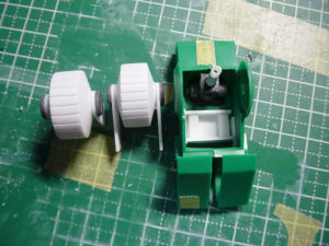 なので、キットの接続軸はポリパーツが挟めるまで削り落とします。
